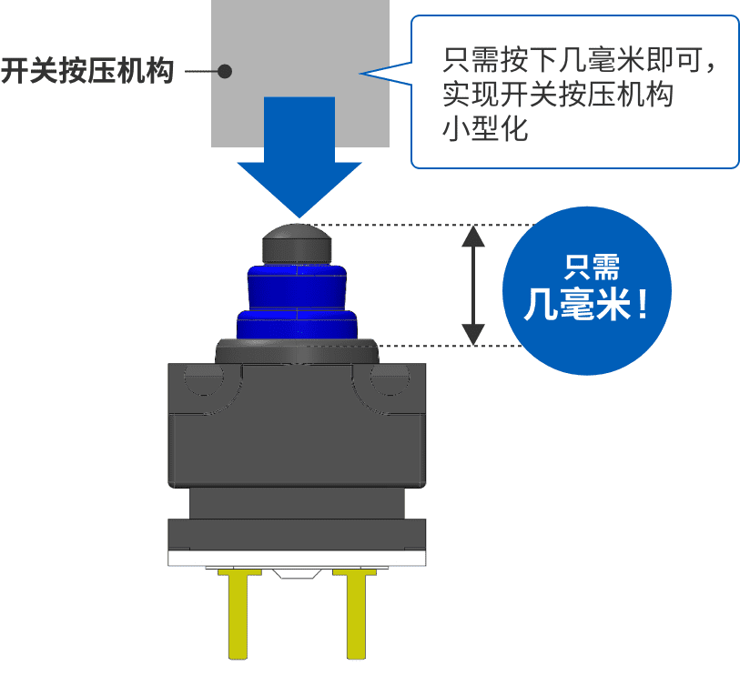 實(shí)現(xiàn)(1)和(2)最簡(jiǎn)單的方法就是從正上方按壓,也就是從行程(完全按下開關(guān)的距離)最短的角度按壓。但要設(shè)計(jì)行程只有幾毫米的超微小型開關(guān)的垂直按壓并不容易。