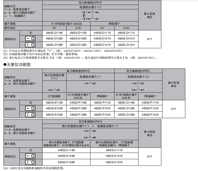 A8GS 遠程復位 船形開關 帶復位功能船形開關 利用基于外部信號的 “復位功能”關閉電源開關,設備的待機功率為零。 適用于浪涌較大的負載的電源ON/OFF。適用于TV-8(浪涌特性117A)。 備有適用于微小負載領域的接點構造種類。 備有可同時ON/OFF微小負載領域、高負載領域的2極規格種類。 接點間隙大于3mm。 取得UL、cUL標準認證,并符合EN標準。