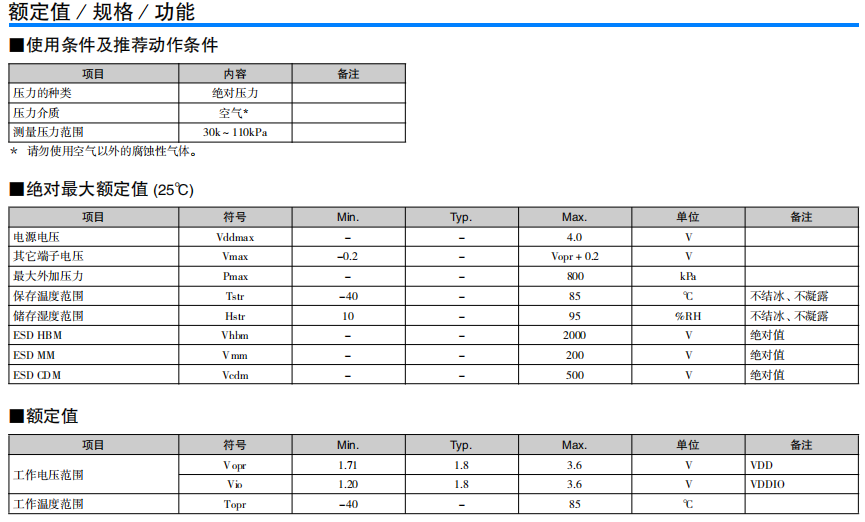高精度·低消耗電流的小型MEMS絕對壓力傳感器 高精度地測量氣壓 內(nèi)置低干擾的24bit ADC 基于I2C/SPI 接口的數(shù)字控制/輸出 在自動睡眠模式下實現(xiàn)低消耗電流 單獨的補償系數(shù)保存在OTP*中 (* One Time Programmable - ROM)